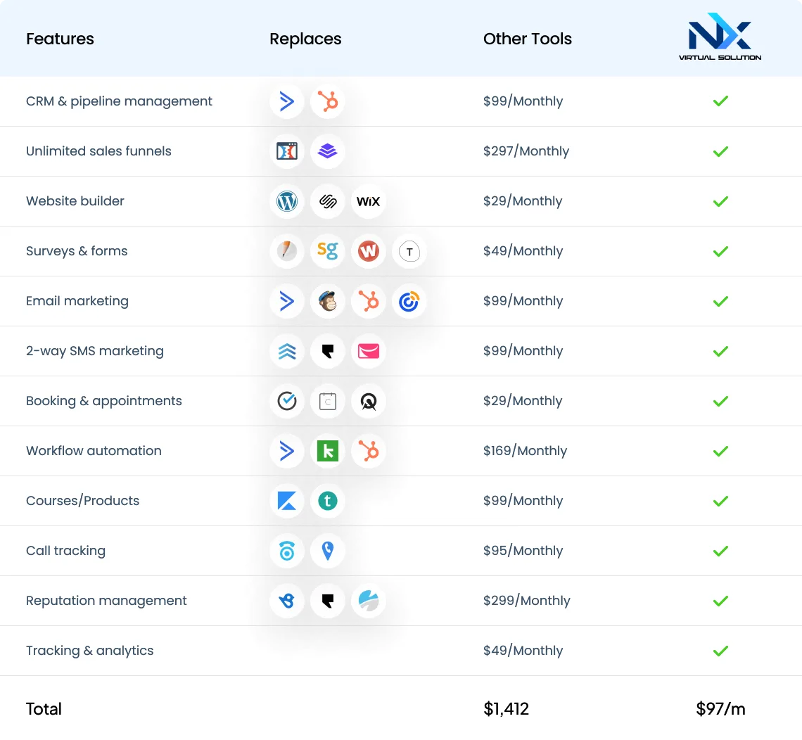 Not to mention how much money you're saving on monthly software subscriptions when you only have 1 fee of $97/m to run a business that can generate $10k-$100k/m+ and beyond.